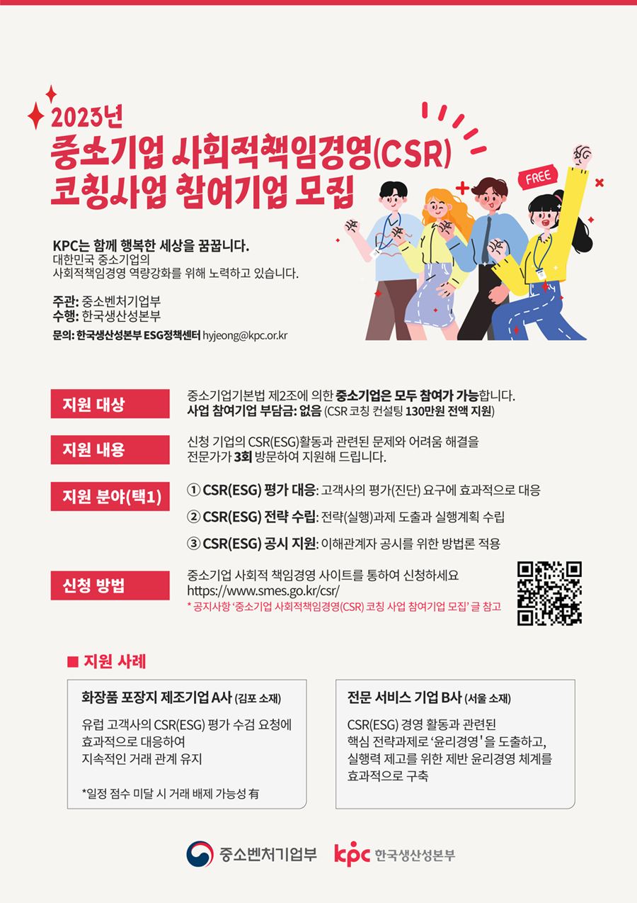 2023년도 중소기업 사회적책임경영(CSR) 코칭 사업 참여기업을 모집합니다.