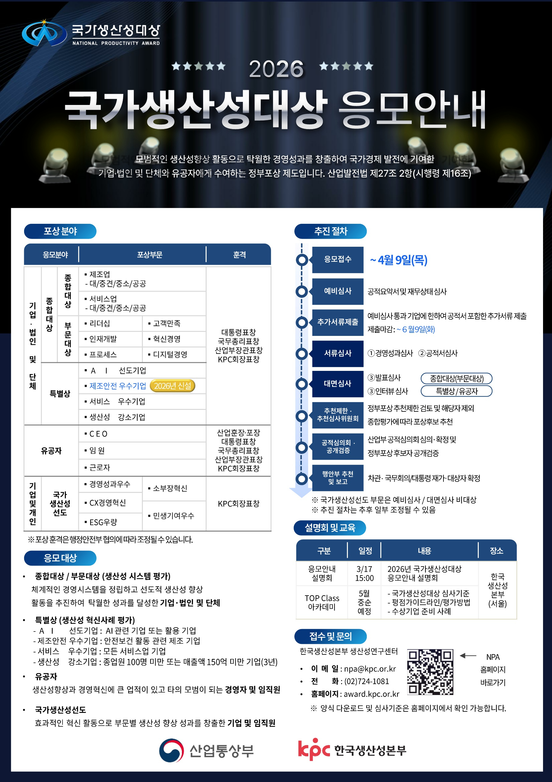 □ 「2026년 국가생산성대상 정부포상」 응모 및 자세한 내용은 국가생산성대상 홈페이지(http://award.kpc.or.kr)에서 확인할 수 있으며, 문의는 한국생산성본부(02-724-1081 / npa@kpc.or.kr)를 통해 가능하다.